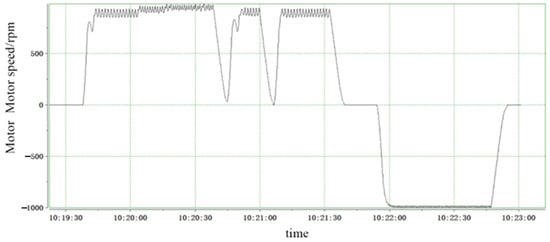 During the simulation, the variation in motor speed is analyzed to assess the vehicle’s motion state. The complete simulation results of motor speed over time are illustrated in Figure 22 and are divided into three phases. In the initial phase, the motor speed is zero. Subsequently, upon receiving the accelerator pedal signal value, the VCU issues a forward command to the MCU, which causes the motor speed to instantly increase and stabilize at a certain level. During reverse operation, the motor rotates in the opposite direction.