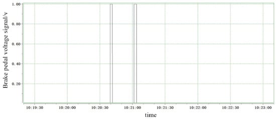 The status of the brake pedal signal is collected, where pressing the brake pedal corresponds to a value of 1 and releasing it corresponds to a value of 0. The relationship between the brake pedal voltage signal and time is illustrated in Figure 23. During the forward rotation of the motor, there are two situations where the speed will decrease. At these moments, the brake pedal signal is recorded as 1, used to simulate the vehicle’s response to emergency situations through braking.