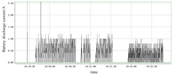 The battery discharge current is depicted in Figure 25. In the initial phase, there is a sudden spike in the signal value, indicating the successful power-up of the vehicle, where the battery experiences an instantaneous discharge current [28,29]. The subsequent blank time period corresponds to the waiting state for the driver’s operational signal input, during which there is no discharge current from the battery. Aside from the initial spike in current at the beginning, another sudden change in current is observed during normal motor operation. This is primarily due to a rapid increase in the accelerator pedal signal, prompting the battery management system (BMS) to receive acceleration commands from the vehicle controller. Consequently, with the motor operating under no load conditions, the discharge current value experiences a sudden increase.