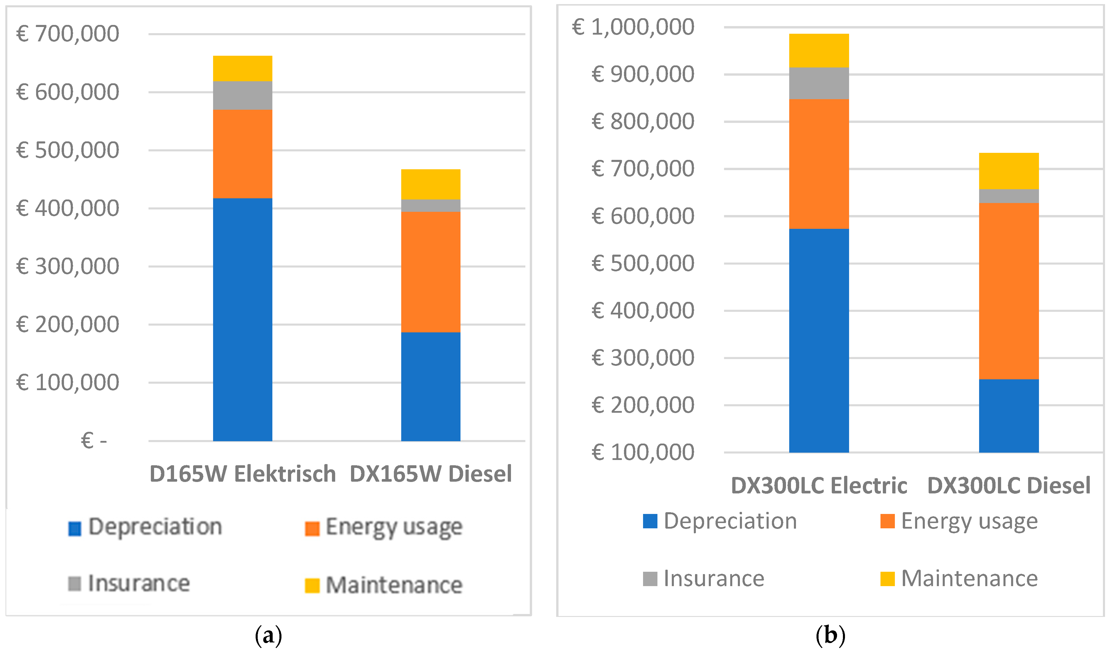 - Zult, M.; van Gijlswijk, R.; van der Mark, P. De Bouwplaats van Morgen: Resultaten Monitoring Elektrische Graafmachines; TNO Report 2024 P11947; TNO: The Hague, The Netherlands, 2024; Available online: https://publications.tno.nl/publication/34643295/humX67IH/TNO-2024-P11947.pdf (accessed on 13 September 2025).