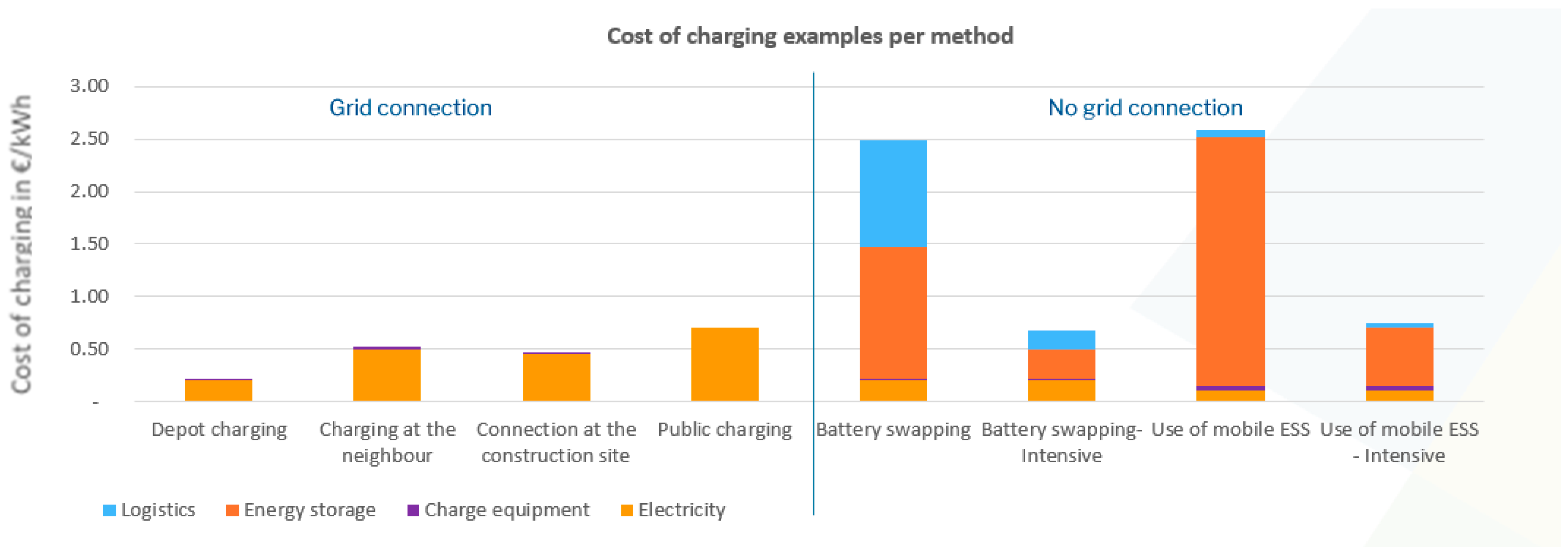 - The costs of charging are very much dependent on the local situation. A grid connection is the most cost-effective. If not available, energy storage and/or logistics give rise to higher costs.