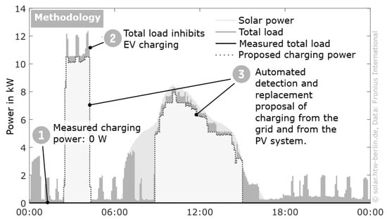 In addition, temporal alignment of the load with PV generation is used as an indicator of solar charging. Potential charging events shorter than 30 min or with an energy content below 3 kWh are neglected, as other applications (e.g., cooking or water heating) are more probable in this range.