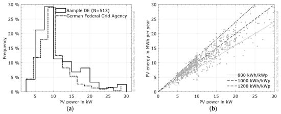 The distribution of the installed PV power is shown in Figure 5a and compared to the distribution of the PV system power between 1 kW and 30 kW according to the German Federal Grid Agency [22]. This highlights the generalizability of the dataset.