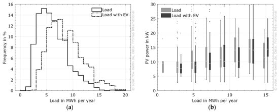 As Figure 1 in Section 2.2 shows, the load of the considered systems can be divided into three parts: total load, household load, and EV load. Figure 6a shows the distribution of the household load and the total load. At the median of the dataset, 5.6 MWh per year are consumed by the household and 8.1 MWh if an EV is included.