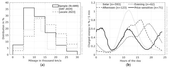 (a) Distribution of the mileage in comparison to different studies. (b) Clustered distribution of charged energy over the day. Data: Fronius International.