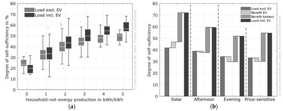 Solar power has a strong diurnal and seasonal progression; car use is dominated by daily or weekly usage patterns. As already shown in Figure 7b, the majority of the sample shows charging behavior adapted to the solar generation. Most of them adapt the charging power to the solar surplus power that would otherwise be fed into the grid. But the question is as follows: to what extent can a solar system power an electric vehicle? And what are the most important factors for a high solar share?
