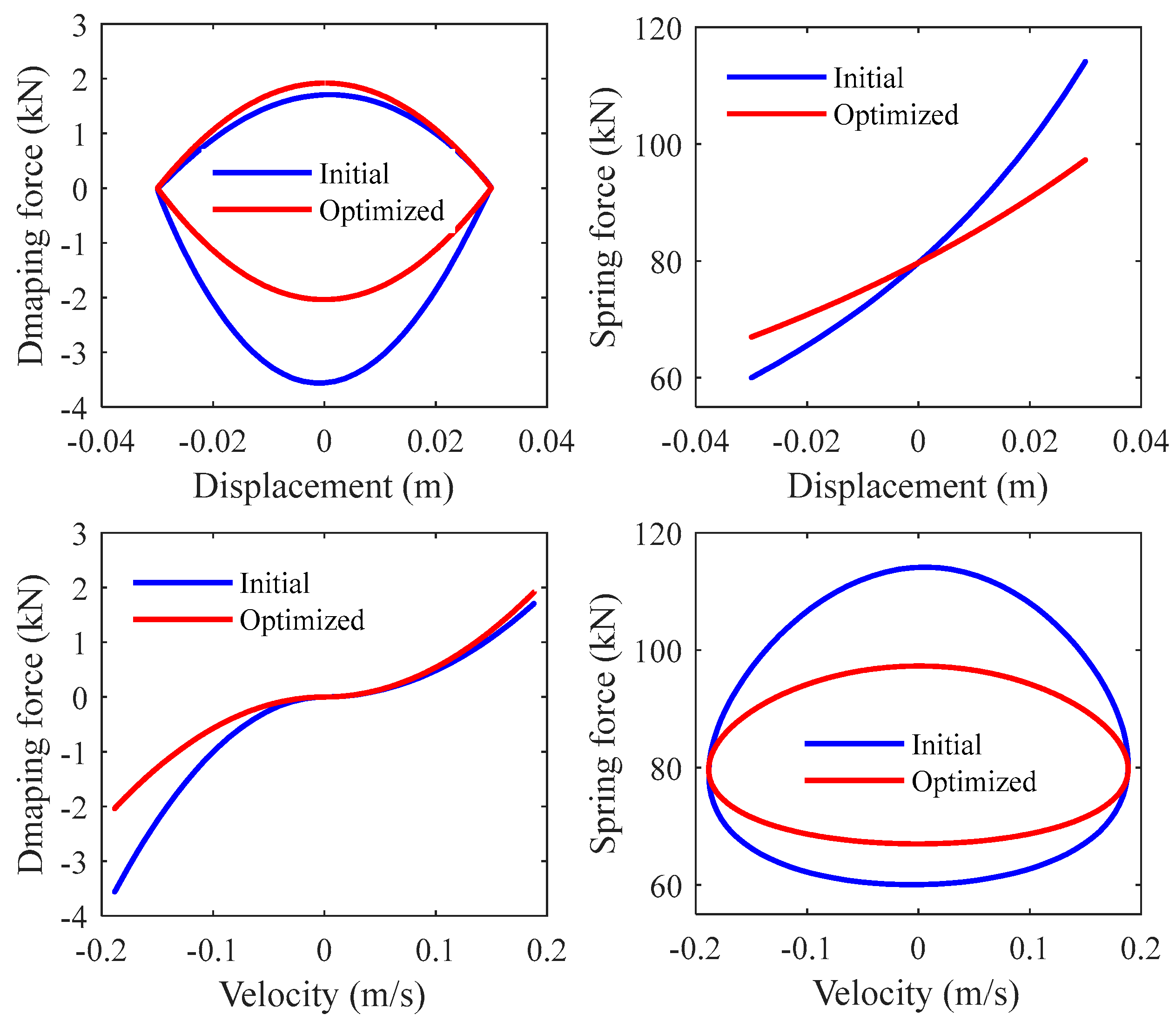 22] introduced a shear-valve magnetorheological hydro-pneumatic spring. They validated this configuration through multiphysics coupling simulations and mechanical tests and further established a nonlinear dynamic model based on the experimental results. In the field of parameter optimization, most research adopts single-objective optimization or experience-based trial-and-error methods, focusing on improving a single performance metric such as ride comfort or wheel grounding performance [
