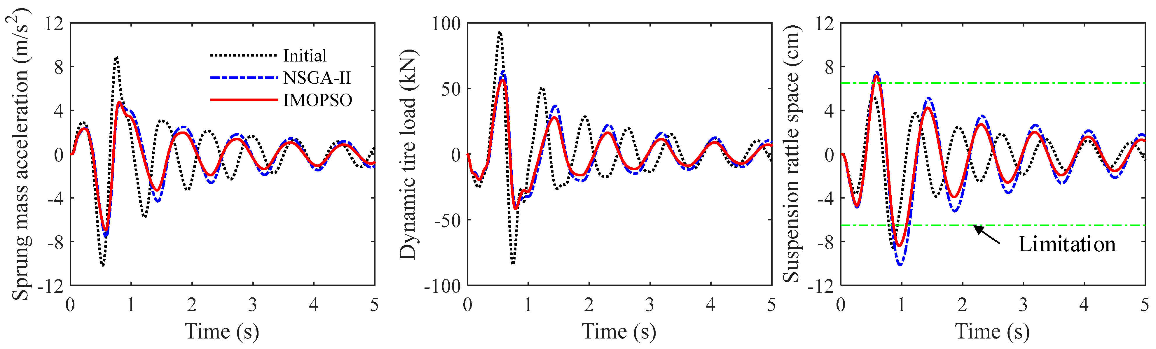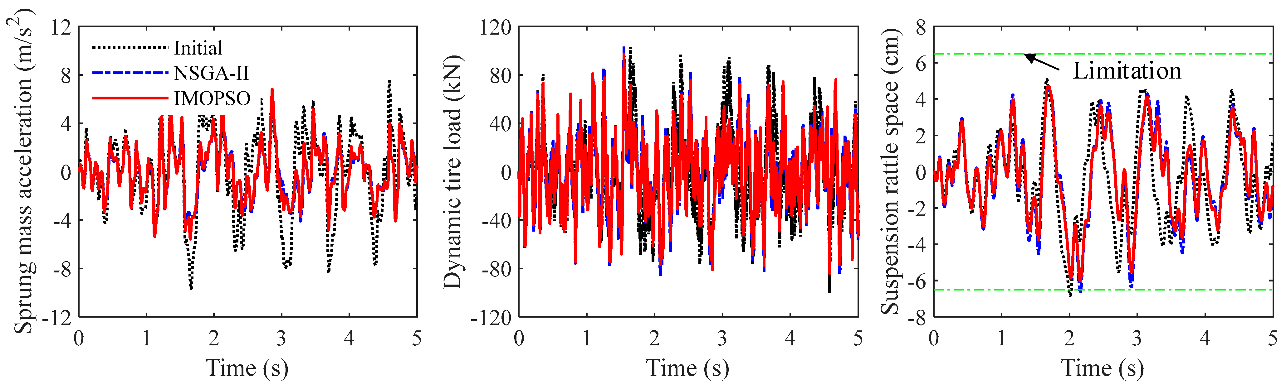 25] proposed a multi-objective optimization method for hydro-pneumatic hybrid suspensions in articulated dump trucks based on the NLPQL algorithm. They established a comprehensive model integrating vehicle dynamics, steering, and tire systems, effectively coordinating the conflicts among body acceleration, roll angle, and pitch angle. Meanwhile, Kwon et al. [