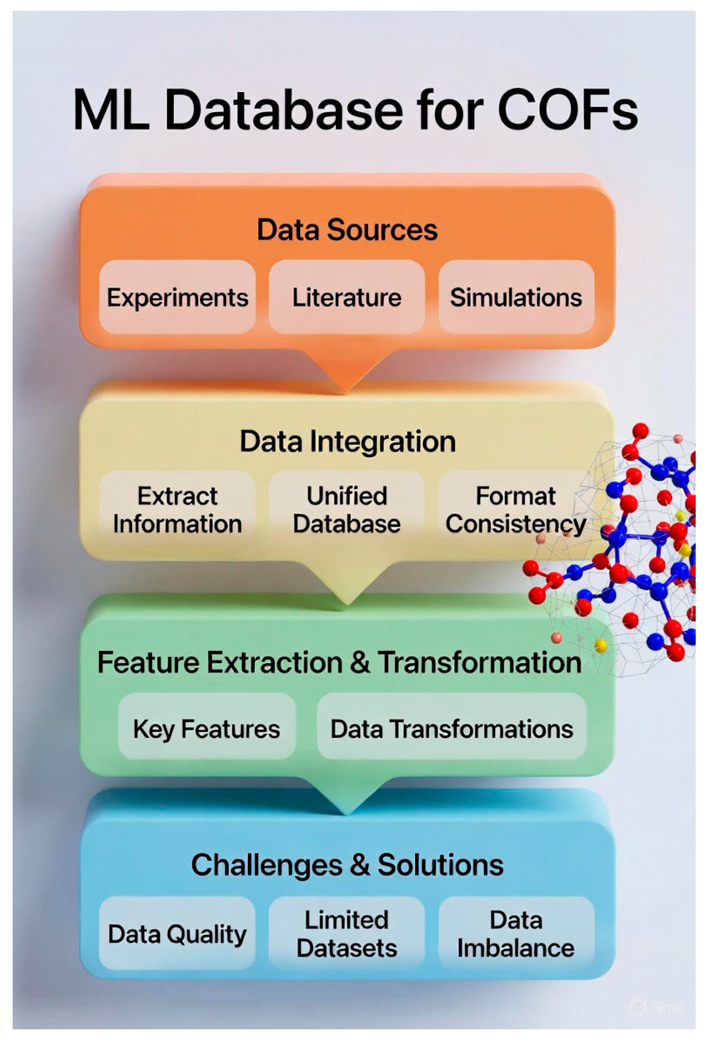 | Structure-property optimization | ML-guided pore/functional group tuning improved COF ionic transport by 37%. | Generalizability to untested COF chemistries remains unclear. | [34,57] |