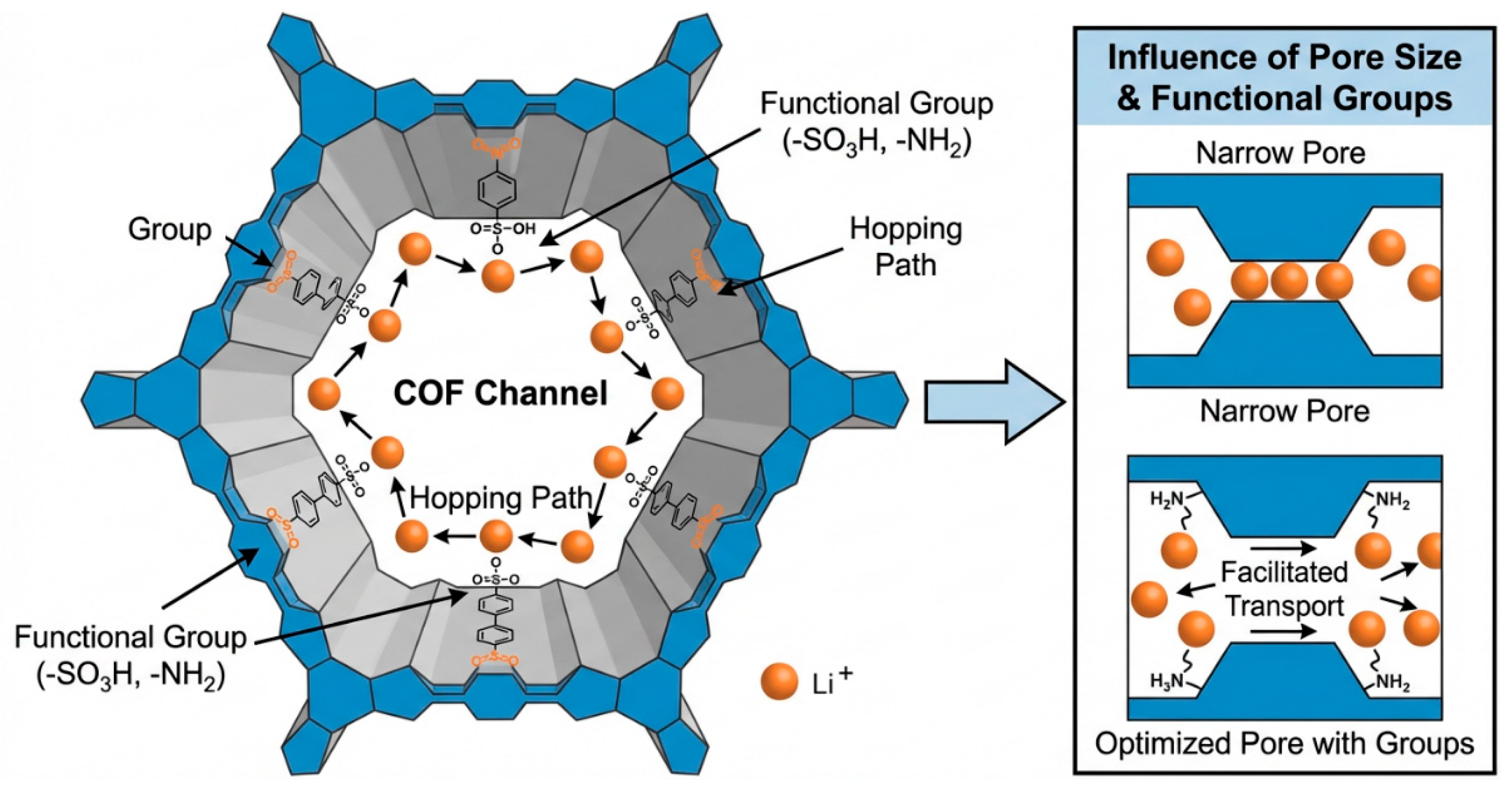 - Zhao, H.; Bo, X.; Wang, X.; Ren, Y.; Wei, Z.; Daoud, W.A. Recent Advances and Perspectives in Single-Ion COF-Based Solid Electrolytes. Batteries 2023, 9, 432. [Google Scholar] [CrossRef]