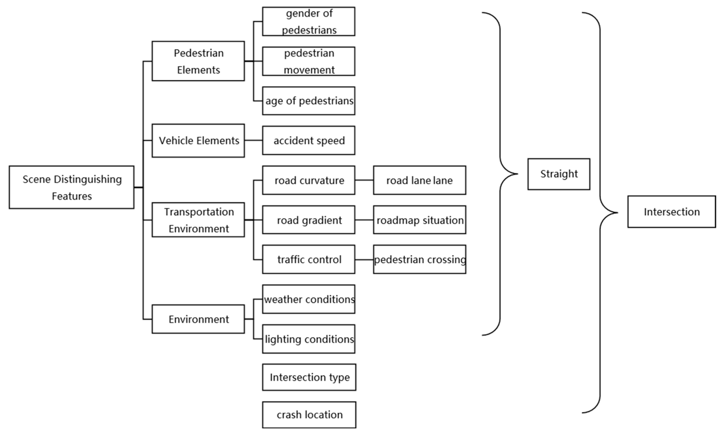 - Qian, Y.; Qiu, Y.; Xiao, L.; Hu, W.; Dong, H. Research on test scenarios of aeb pedestrian system based on knowledge and accident data. Int. J. Veh. Saf. 2022, 12, 322–343. [Google Scholar] [CrossRef]