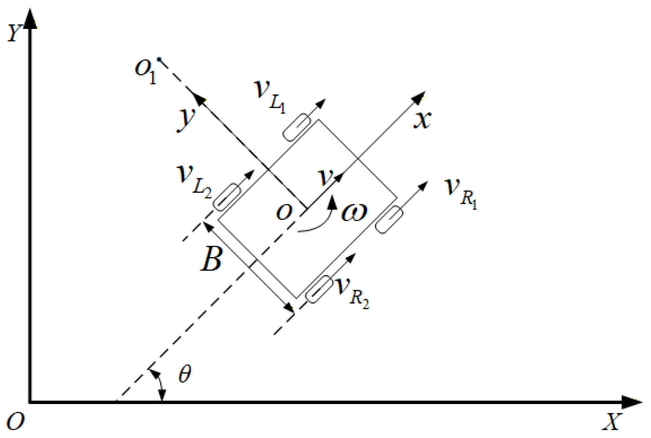 - The four drive wheels are symmetrically arranged, with identical linear velocities for wheels on the same side.