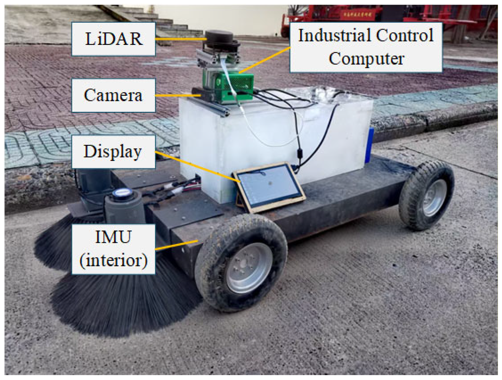 - Huang, X.T. Design and Implementation of Autonomous Sweeping Vehicle for Factory. Master’s Thesis, Beijing Forestry University, Beijing, China, 2020. [Google Scholar]