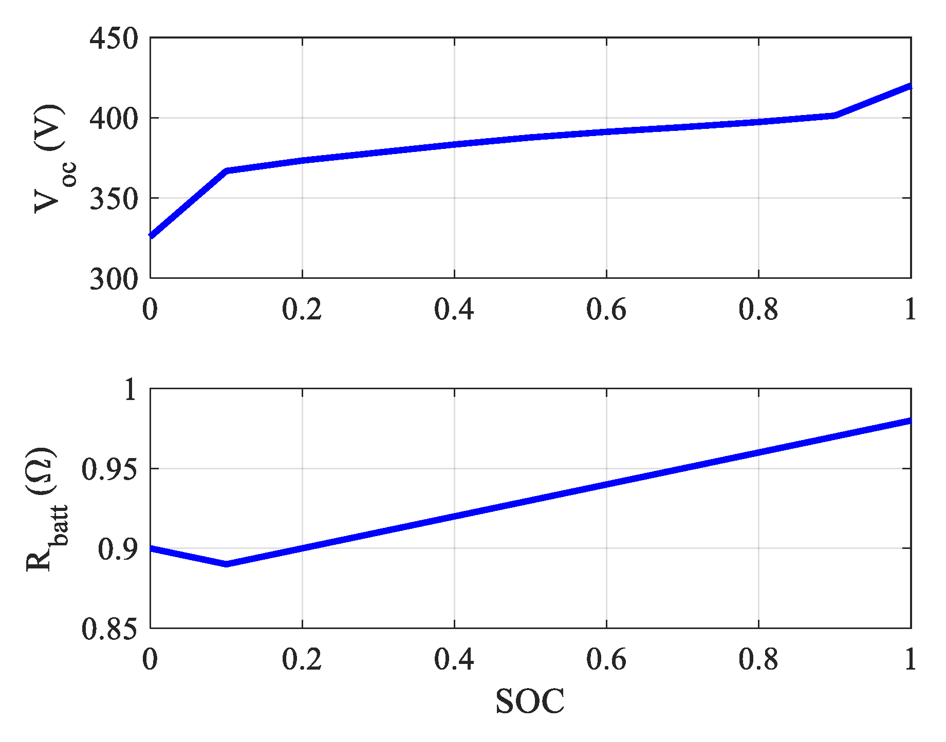 - The battery is described by an equivalent circuit model, where the open-circuit voltage and internal resistance are functions of state of charge (SOC) only.