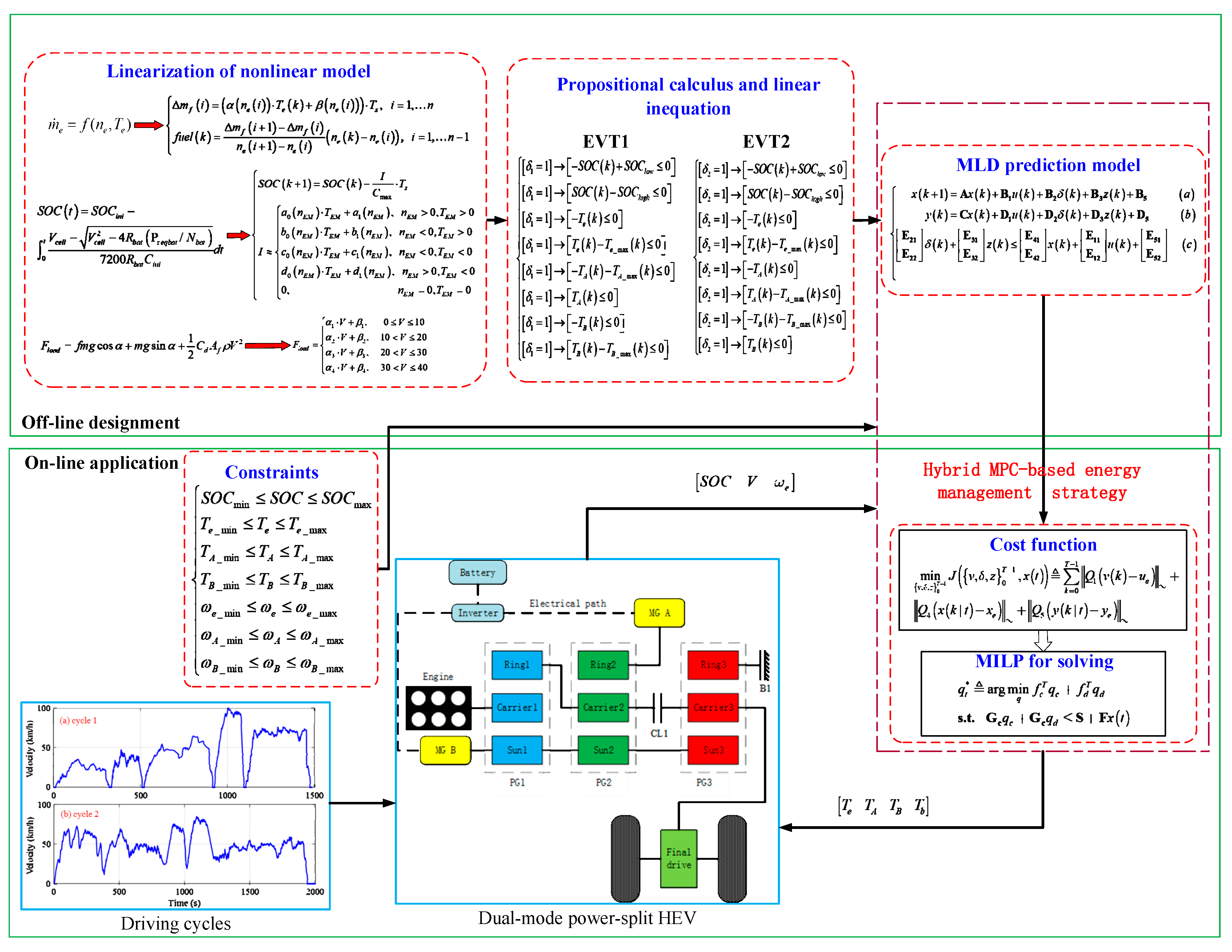 - Li, X.; Wang, W.; Yuan, Y.; Li, H.H.; Qiu, S. An online optimal energy management strategy for a dual-mode power-split hybrid electric vehicle based on hybrid MPC Algorithm. J. Phys. Conf. Ser. 2021, 1754, 012135. [Google Scholar] [CrossRef]