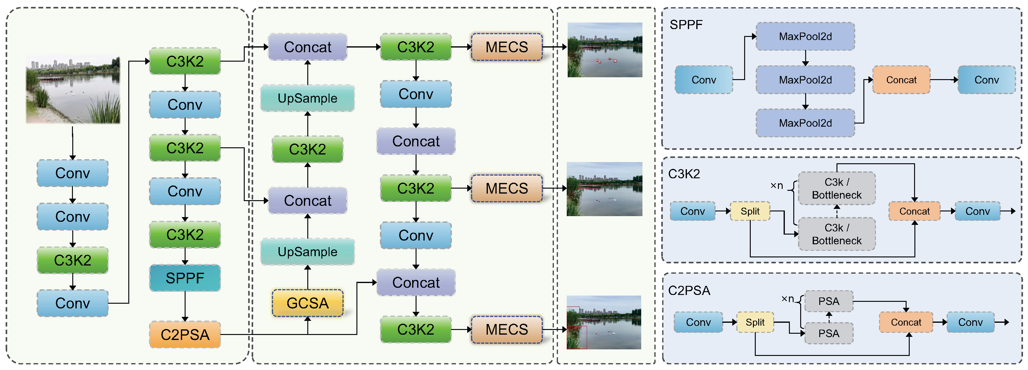 Figure 1, the proposed architecture preserves the lightweight and high-throughput characteristics of YOLOv11, while introducing deployment-oriented improvements for reflective water-surface small-object detection. The overall design aims to strengthen multi-scale contextual representation, improve the perception of weak-boundary targets under background interference, and enhance bounding-box regression quality under the strict compute and power constraints of embedded devices [