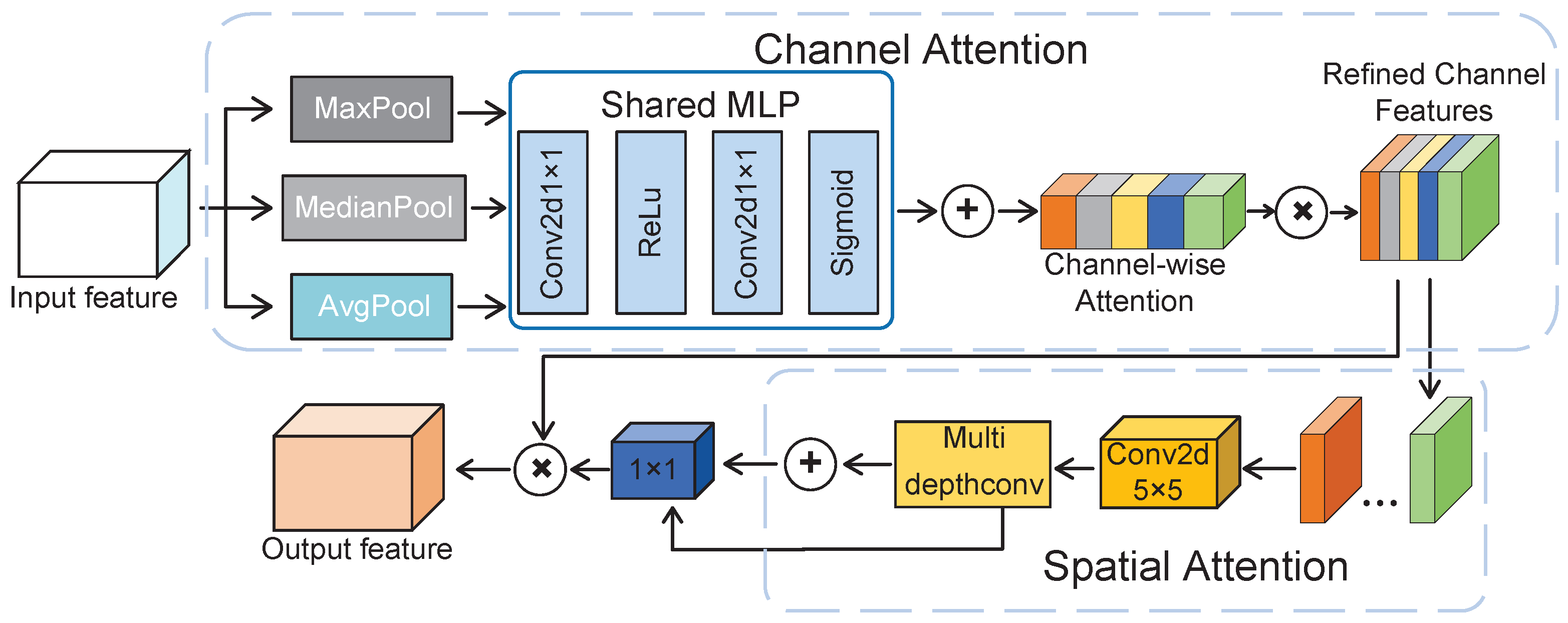 Figure 2, the GCSA module independently models attention weights along the channel and spatial dimensions of the input feature map and then fuses them to enhance feature representation. Let the input feature map be denoted as
