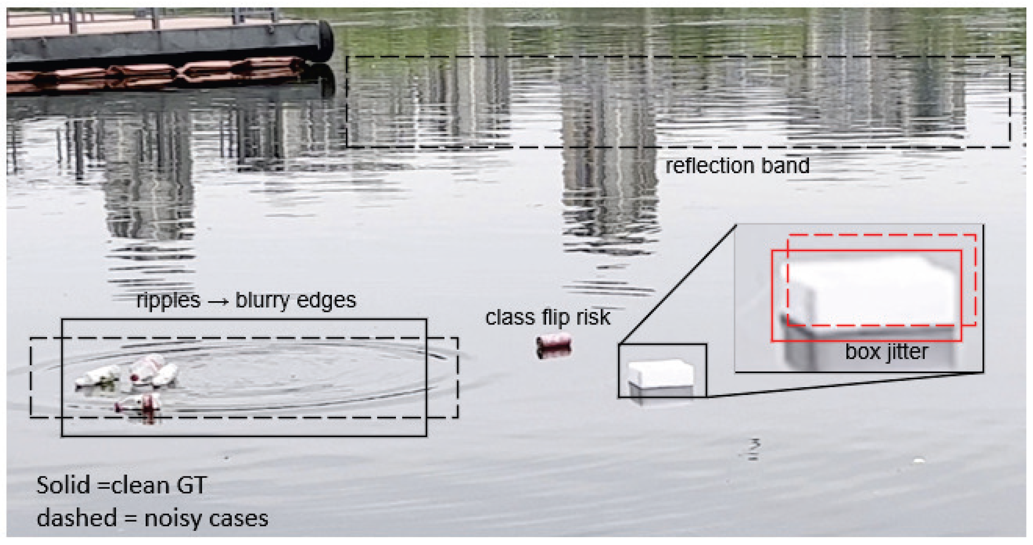 Water-surface frames inevitably contain specular highlights, reflection bands, and ripple-induced distortions, which may introduce imperfect supervision. Typical cases include missing boxes, class ambiguity (e.g., can vs. bottle), and box jitter, as illustrated in
