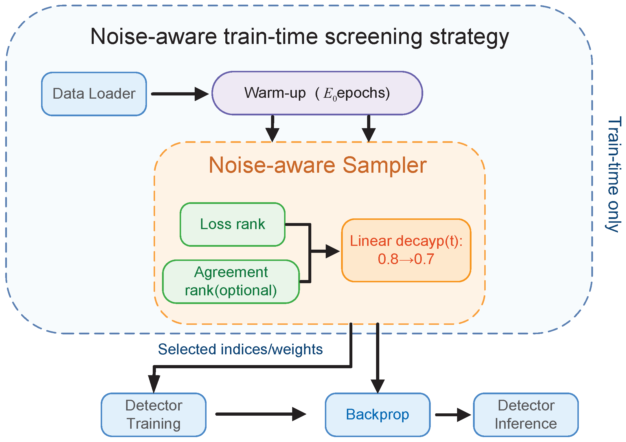 To reduce the influence of these artifacts while keeping the detector architecture unchanged, this paper adopts a lightweight train-time noisy-label screening strategy, as shown in