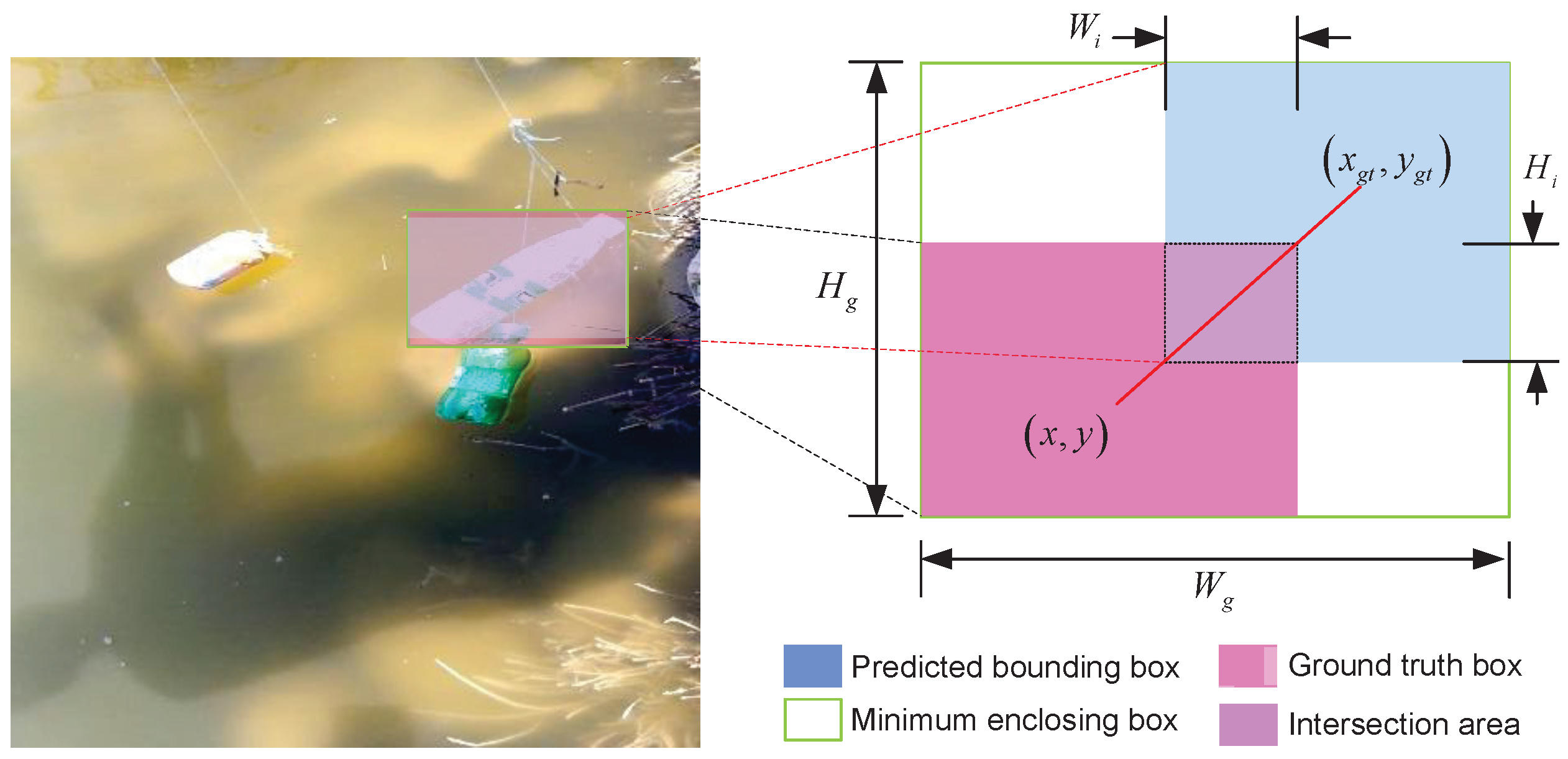 In water-surface small-object detection, targets typically exhibit small size, blurred boundaries, and irregular shapes. These characteristics are further aggravated by ripples, specular reflections, and background clutter, which can induce center deviations and shape mismatch between predicted boxes and ground-truth boxes. Under such conditions, relying solely on the overlap ratio in conventional IoU-based objectives may provide insufficient sensitivity to spatial misalignment, thereby limiting gradient quality for precise localization.