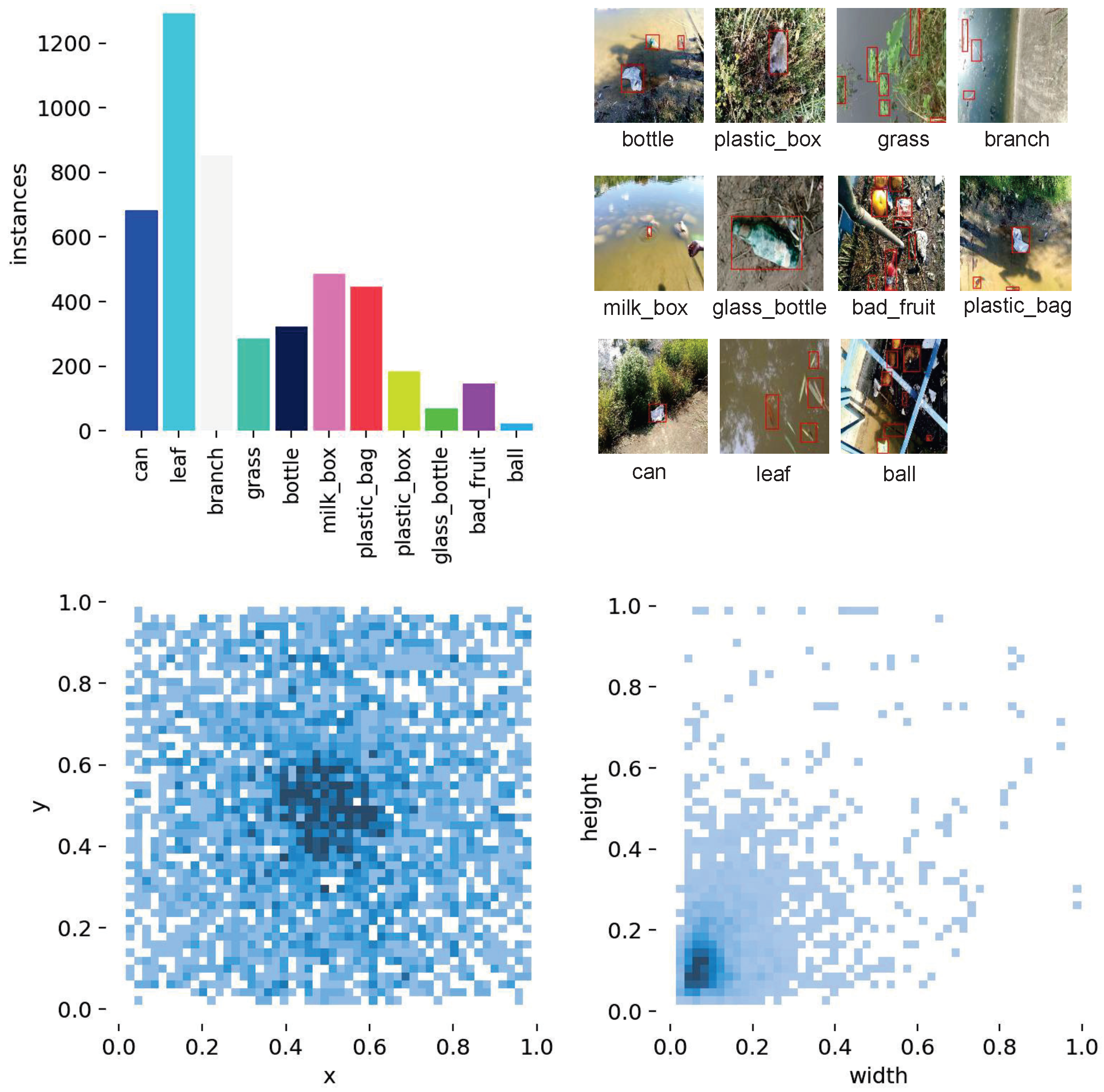 Figure 8, the top-left region indicates a naturally imbalanced category distribution, where classes such as can occur more frequently, while rare classes such as ball and bad_fruit are underrepresented. This long-tail distribution is consistent with the frequency characteristics of real floating debris. The right region provides representative annotation samples for 11 classes across different materials, sizes, and water-surface backgrounds, further demonstrating the diversity and complexity of the collected data.