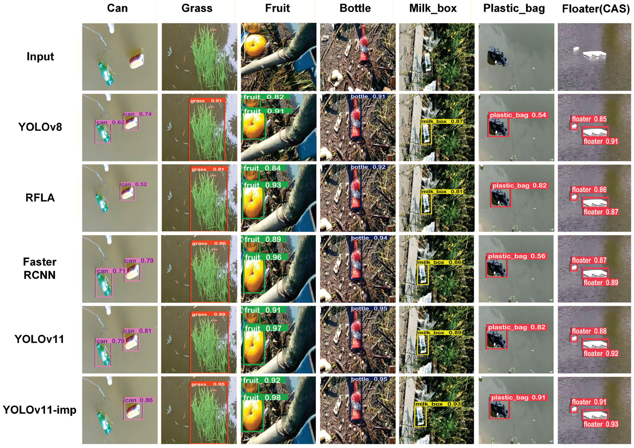 Figure 10 presents representative qualitative detection results of YOLOv11-IMP and several mainstream detectors on eight typical categories of water-surface debris, namely branch, can, grass, fruit, bottle, milk_box, plastic_bag, and floater (CAS). Under challenging conditions such as specular reflections, aquatic-plant occlusion, blurred boundaries, and low resolution, YOLOv11-IMP generally produces tighter bounding boxes, fewer missed detections, and fewer fragmented predictions. These visual results indicate that the proposed design improves robustness in reflective and cluttered water-surface scenes.