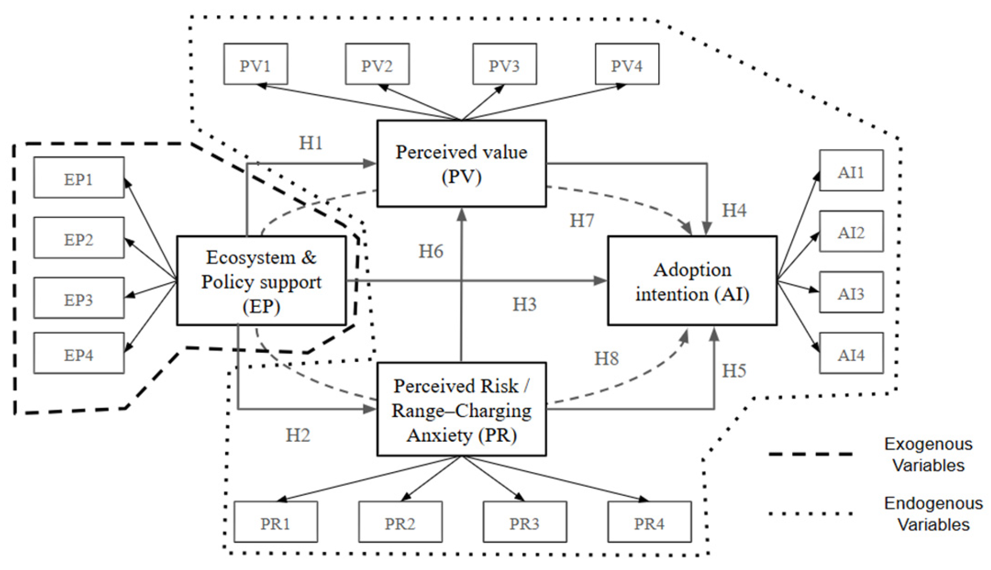 Ecosystem and policy support (EP) is conceptualized as an exogenous latent construct that exerts influence on both perceived value (PV) and perceived risk (PR). This construct encompasses the salience of financial incentives and excise tax benefits, the availability and spatial coverage of public charging infrastructure, the quality and reliability of fast-charging services, and the provision of EV-friendly electricity tariffs alongside home-charging support. Collectively, these ecosystem and policy elements play a critical role in shaping consumers’ intentions to adopt electric vehicles.