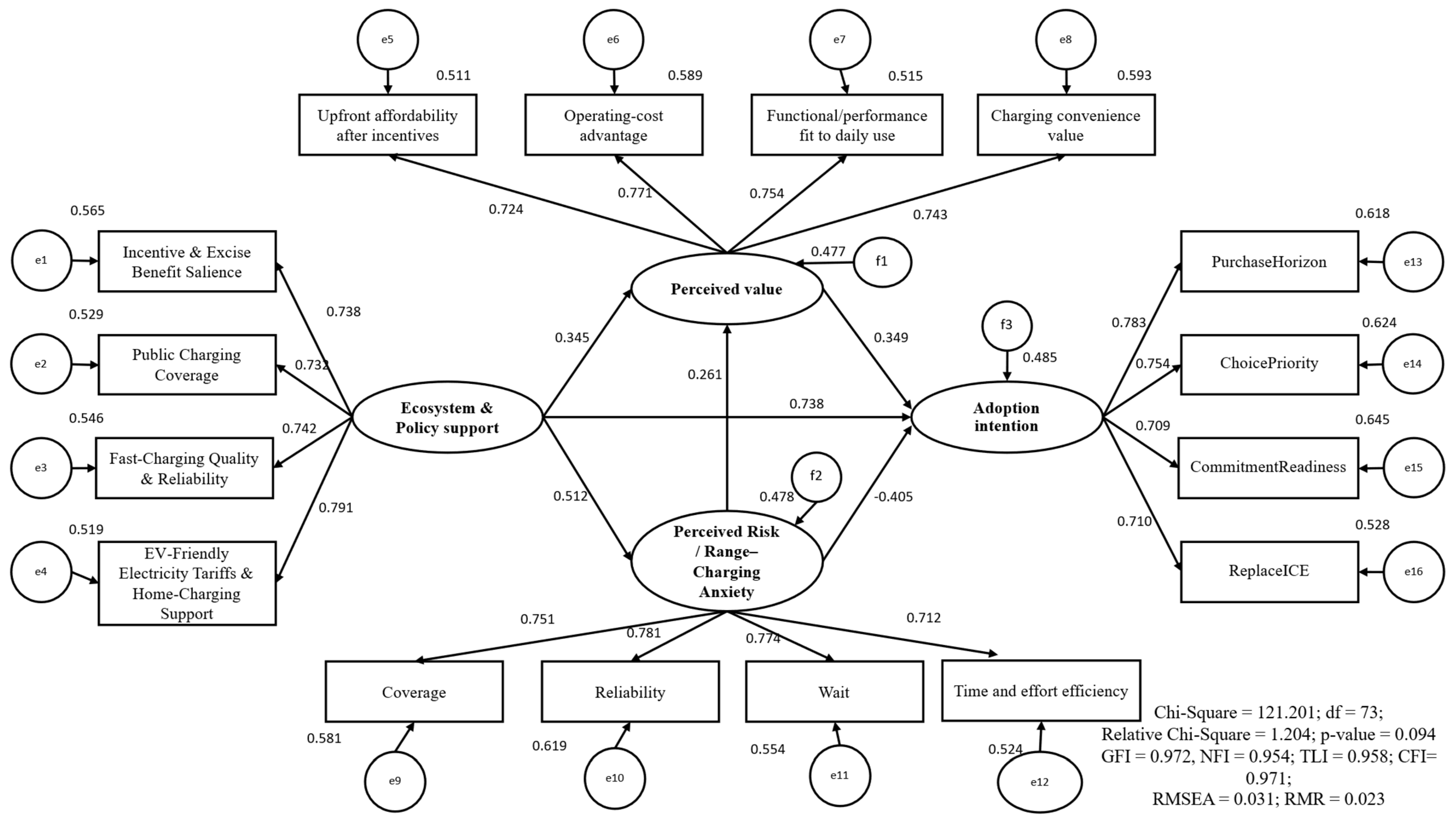 Figure 1 shows three endogenous latent constructs are specified in the model. The first captures perceived value, incorporating dimensions such as post-incentive purchase affordability, operating cost advantages, functional and performance suitability for every- day use, and the value of charging convenience. The second construct represents perceived risk, integrating concerns related to infrastructure coverage, system reliability, waiting time, and technological uncertainty. The third latent construct reflects adoption intention, operationalized through indicators including purchase timeframe, prioritization in vehicle choice, readiness to commit, and the importance attributed to charging convenience.