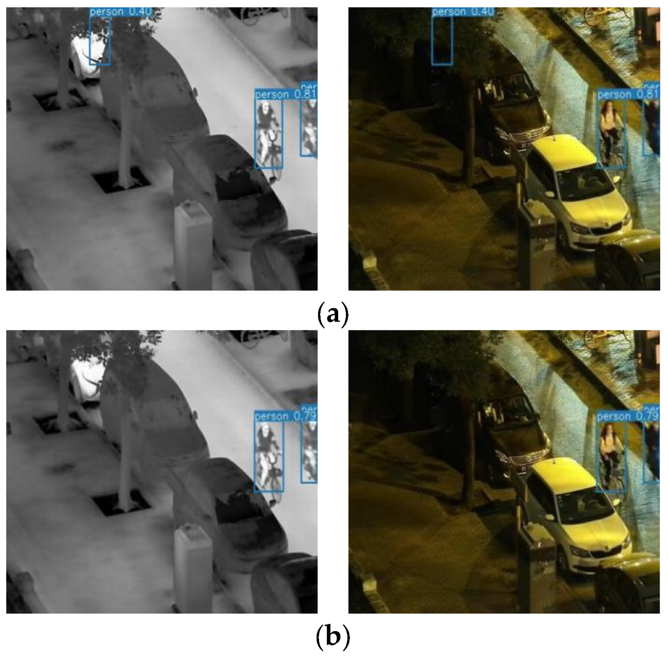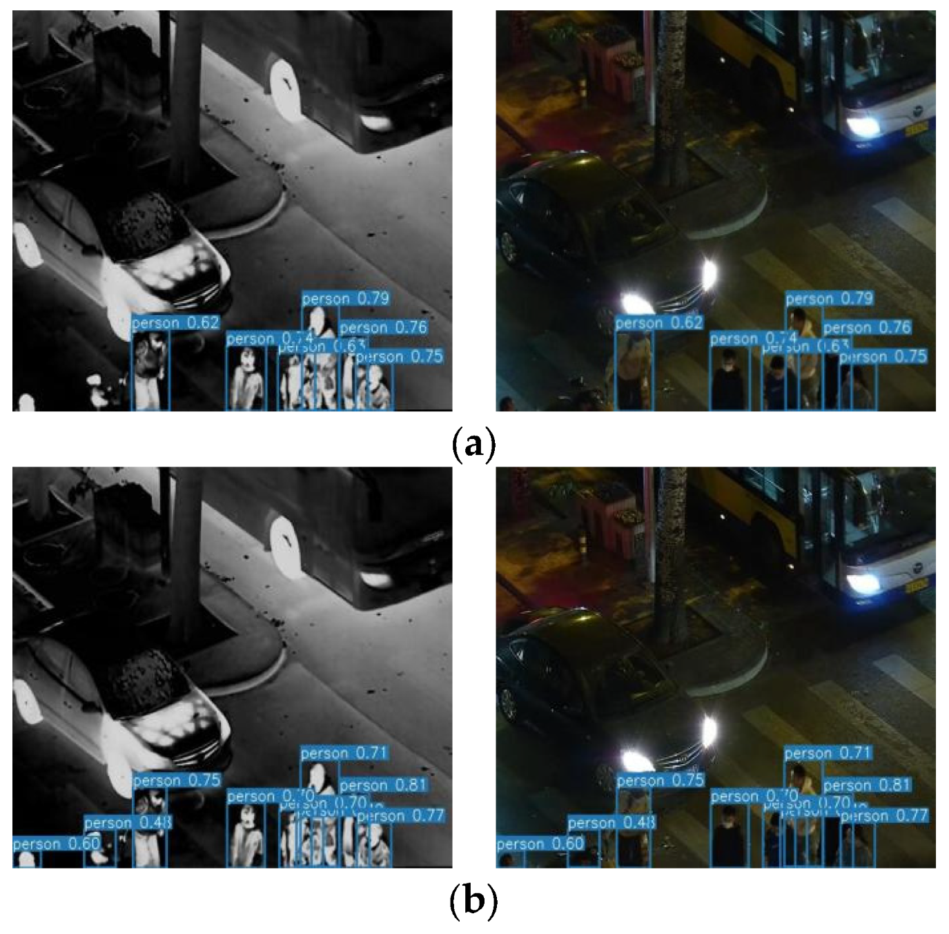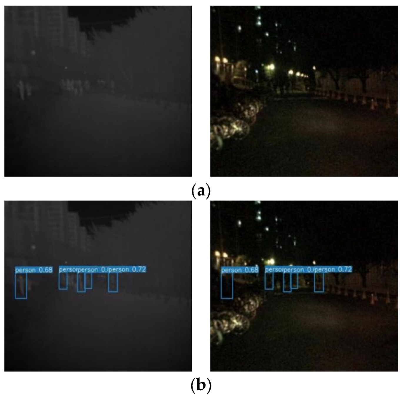 - Li, Z.; Li, X.; Niu, Y.; Rong, C.; Wang, Y. Infrared and Visible Light Fusion for Object Detection with Low-light Enhancement. In Proceedings of the 2024 IEEE 7th International Conference on Information Systems and Computer Aided Education (ICISCAE), Dalian, China, 27–29 September 2024; IEEE: New York, NY, USA, 2024; pp. 120–124. [Google Scholar]