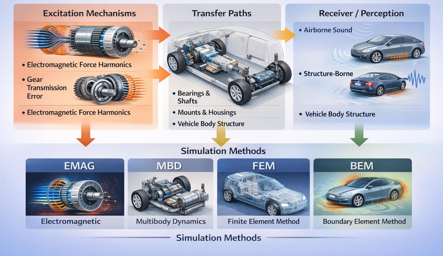 Future EV NVH research will therefore benefit from models that are not only multiphysics in nature, but also explicitly system-level, frequency-aware, and perception-oriented from the earliest design stages.