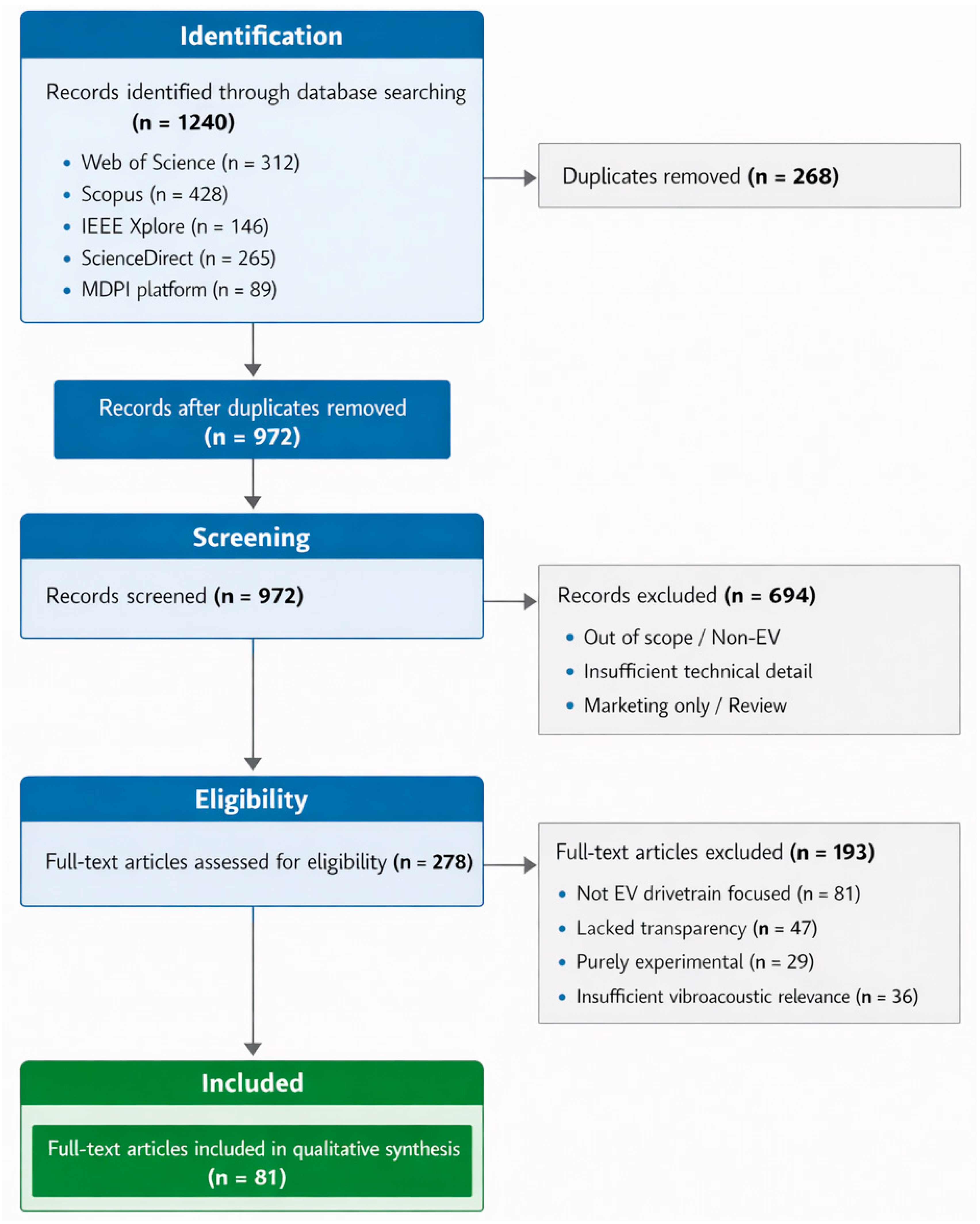 Searches were conducted across Web of Science, Scopus, IEEE Xplore, ScienceDirect, and MDPI’s journal platform, reflecting the multidisciplinary nature of e-NVH (electrical machines, drivetrain dynamics, structural vibration, acoustics, and sound quality).