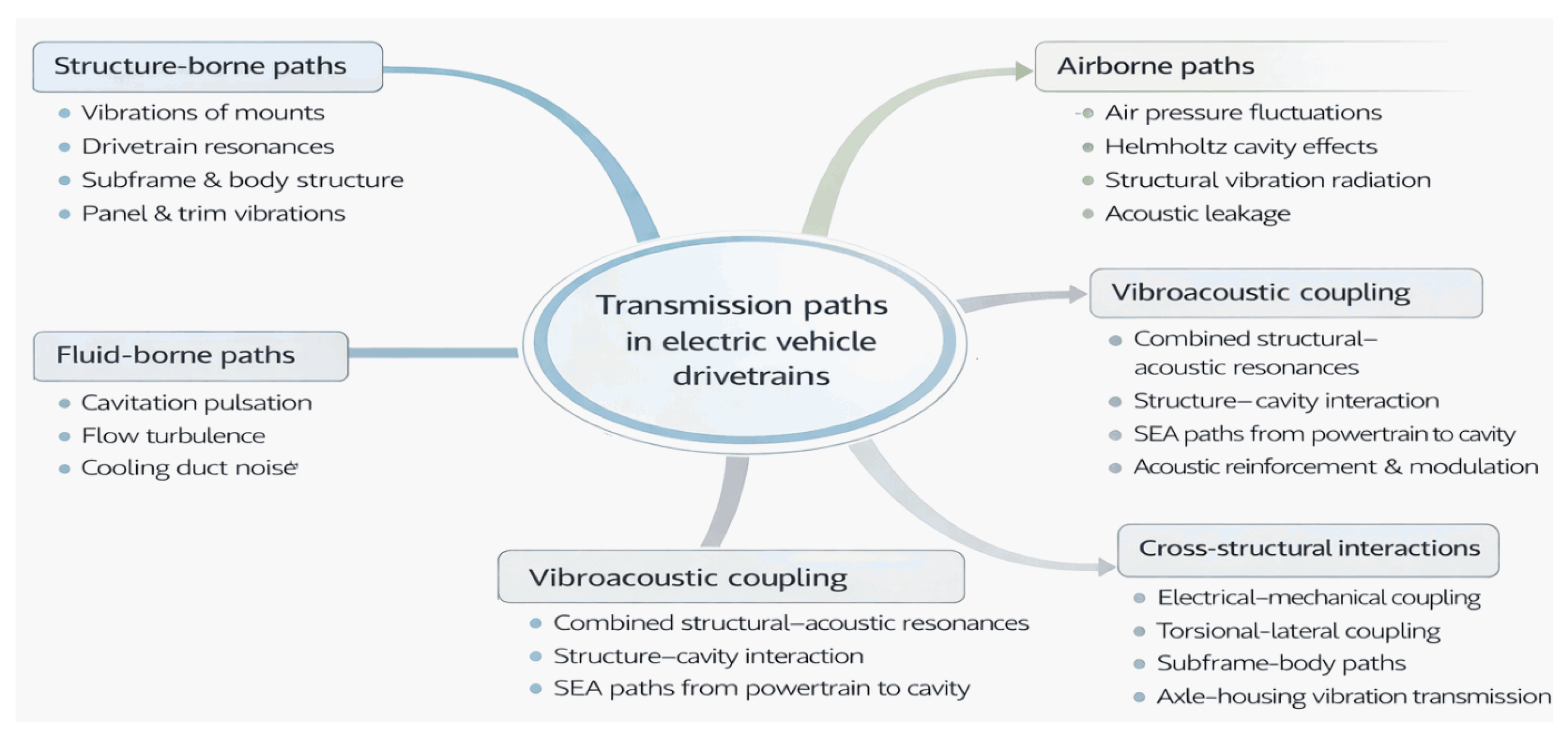 In electric vehicle drivetrains, structure-borne transmission through shafts, bearings, housings, mounts, and body interfaces often dominates the low- and mid-frequency NVH response [