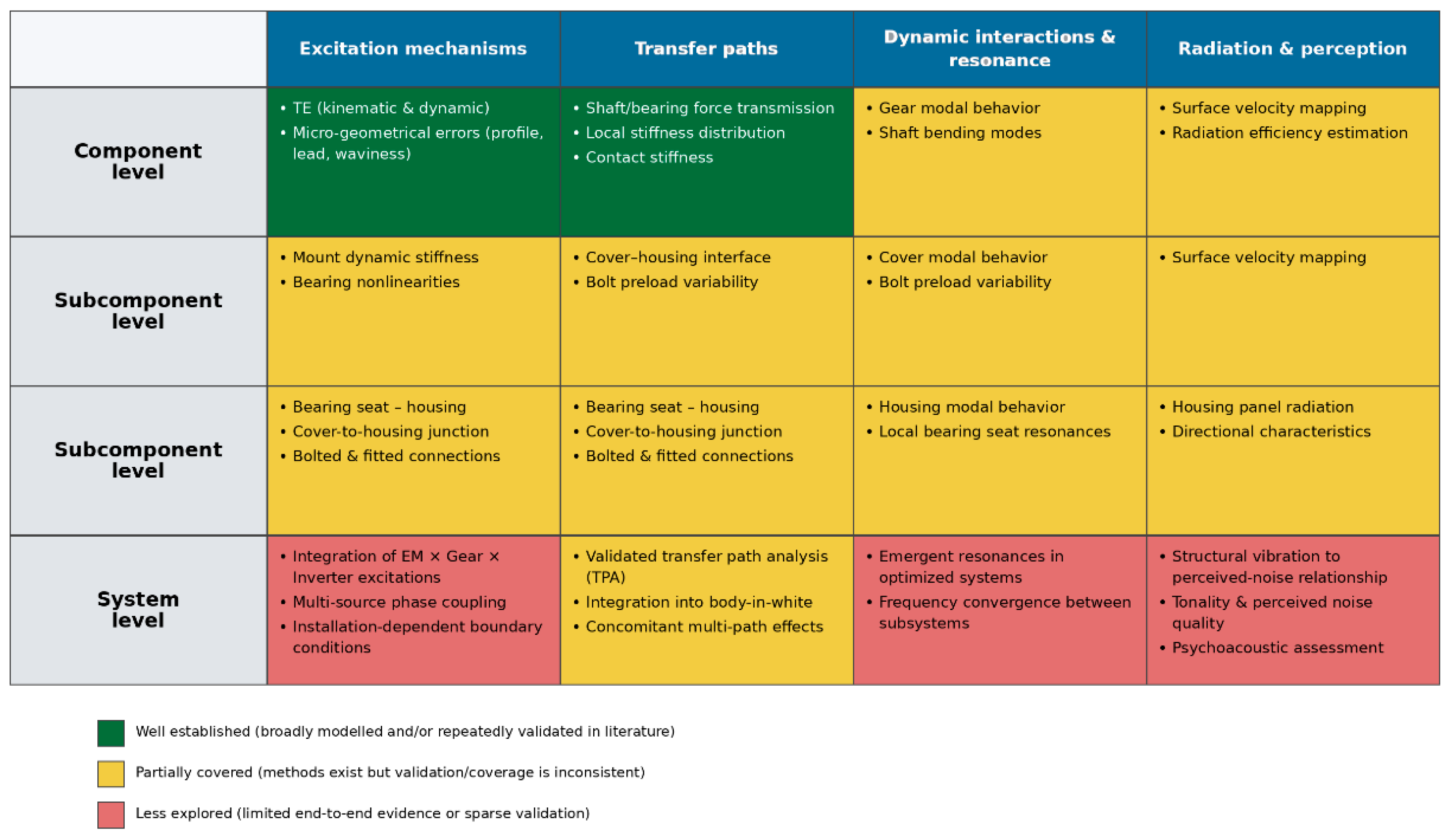 While excitation mechanisms such as transmission error and electromagnetic force harmonics are well understood at the component level, substantially less attention has been devoted to their interaction through system-level transmission paths and to the conversion from structural vibration to perceived noise. This imbalance indicates that future research should prioritize integrated, system-aware NVH modeling frameworks that explicitly account for installation effects, incorporate manufacturing variability, and include more robust vibration-to-perception mappings.