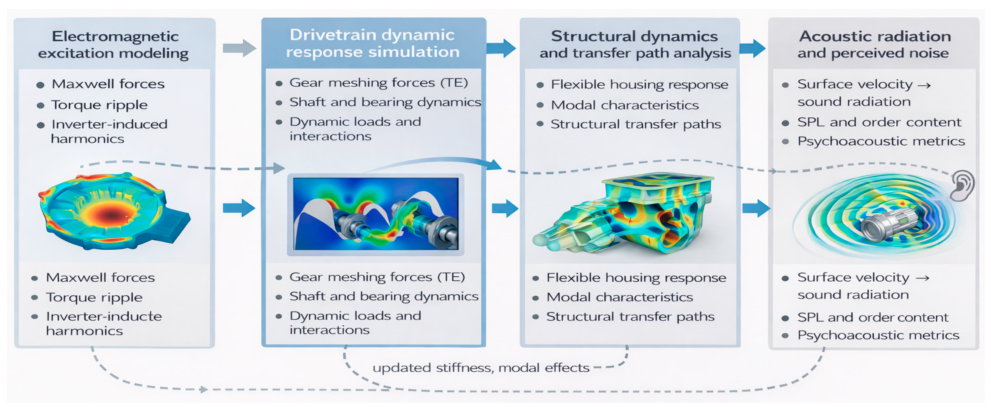 The common workflow begins with source-side excitation extraction, such as electromagnetic force densities, torque ripple, or gear-mesh-related excitations. These quantities are then propagated through drivetrain dynamics and flexible structural subsystems, after which response variables such as interface forces, reduced flexible-body states, or surface velocity fields are transferred to acoustic and perception-oriented post-processing. Commercial software platforms implement these stages differently, but the scientific structure of the workflow is defined more by the exchanged state variables, interface assumptions, and validation checkpoints than by the specific solver names.