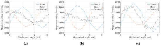 Considering the slotting of the stator and rotor, as well as the saturation in the magnetic permeance , both the mmfs of stator and rotor, and , and their spatial position are the main focused parts for changing the operating points and subsequently the noise emissions. In Figure 2b,c the magneto motive forces are calculated for three different d-q-axis currents for 60 Nm of torque, as shown in the d-q-diagram in Figure 1. It is shown that the position and the amplitude of the magneto motive forces (mmfs) depend on the slip of the induction machine.