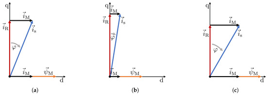 Schematic diagrams for (a) reference, (b) minimum and (c) maximum stator d-axis current at 60 Nm of torque.