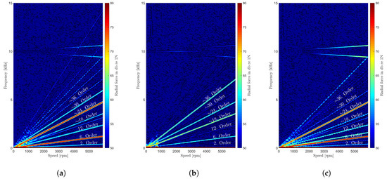 The harmonics content of each operating set at 60 Nm of torque is shown for simulated speed run-ups in the Campbell diagrams in Figure 4a–c. These Figures show the temporal frequency decomposition of the radial forces over the mechanical machine rotor speed. Since the voltage is produced by a pulse width modulation (PWM) inverter, thus the voltage supply is non-sinusoidal and same given to each operating system. It is shown, that the d-q-axis operating point and subsequently the magneto-motive force, as well as the saturation of the magnetic permeance have a huge influence on the electromagnetic force excitation, as explained in the following.