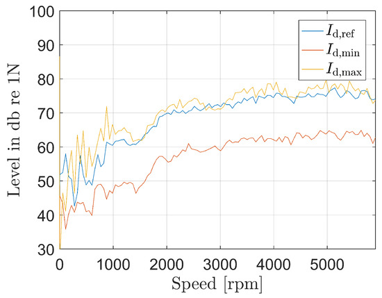 The simulation of the radial force decomposition can also be viewed as the force levels in Figure 5, calculated as the summed magnitudes over all frequencies for each rotor speed. It is shown, that the radial force level in the minimum d-axis current and subsequently in the minimum flux is always lower than the radial force levels of the reference and maximum flux operating, caused by the reduced amplitudes of saturation, PWM harmonics as well as the reduction of the fundamental flux. The calculation of the level of the radial force neglects the damping of the structural dynamics system of the stator and a A-weighting in order to validate the noise perception of the humans hearing. However, the force decomposition in minimum flux operation gives a strong indication for noise reduction.