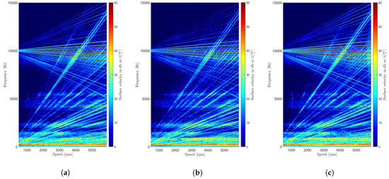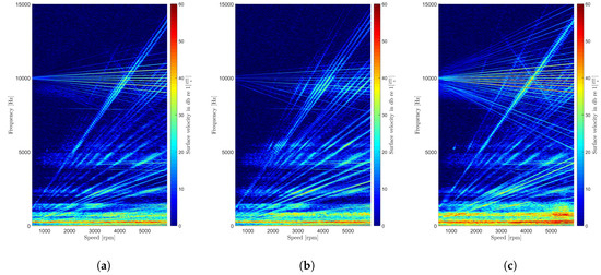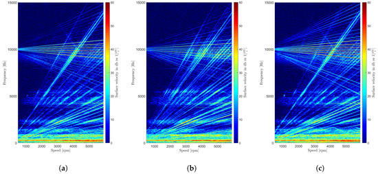 The measured surface velocity levels for speed run-ups of 60 Nm and 100 Nm of torque are shown in Figure 8b,c. The reference, minimum and maximum flux operating differences are not as big as in the measurements for 20 Nm of torque. The theses from Section 2 are also approved for these operating points. Relating to the slotting, saturation and PWM-harmonics, the measurements picture same behavior, as shown for the 20 Nm of torque measurements, shown in the Campbell diagrams for 60 Nm of torque in Figure 9a–c and 100 Nm of torque in Figure 10a–c. Due to the stator current limitation, the operating range for higher torques gets more and more limited, which reduces the difference between the choosable flux range and shrinks the differences between the measurements.