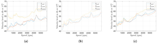 The measured surface velocity levels are shown in Figure 8a for speed run-ups at 20 Nm of torque. The reference, minimum and maximum flux operating shows huge differences. As described in Section 2, the minimum flux operation has mainly the lowest velocity level, but there are also operating points, where the operation in reference flux is beneath the minimum flux curve. These points can be explained with the Campbell diagrams in Figure 7a–c. The saturation in this operating point is less, increasing the d-current, increases the flux and the saturation, as well as the PWM-harmonics. This causes the high level of surface velocity for the maximum flux operating. Due to the operating in minimum flux, the PWM-harmonics, as well as the saturation harmonics are minimized, but the slotting harmonics are increased. If the slotting harmonics in this operating come up with the natural frequencies of the system, the slotting harmonics become prominent and increase the velocity level over the reference level.
