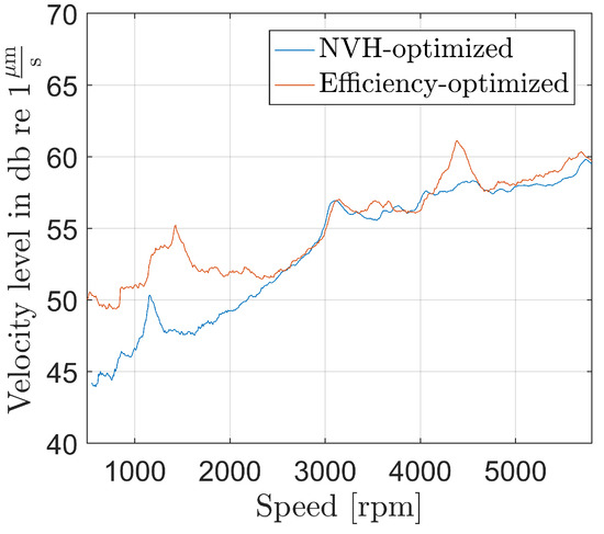 The optimized strategy is validated with a surface velocity measurement speed run-up at 40 Nm of torque. Figure 14 shows the comparison of the measured NVH-optimized and efficiency-optimized strategy. Because of the influences of temperature, the velocity levels at low speeds are not completely matching. After reaching the same operation temperature, the NVH-optimized strategy follows the efficiency-optimized velocity level, but changes the flux level in order to reduce the velocity levels for the given optimization criteria. The operating points 3500 rpm and 4300 rpm of rotor speed illustrate and support the validity of changing the operating strategy in order to reduce the noise emission of the electrical drive.
