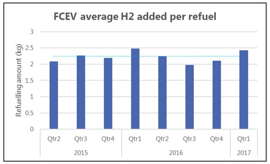The refuelling behaviour of the FCEVs over the demonstration period is summarised in Figure 3. The average refuelling amount was 2.2 kg (ca. 60% of the tank capacity of 3.7 kg), and the average distance between refuellings was 170 km. These figures have remained almost constant throughout the trial, and show little evidence of any range anxiety effects, which otherwise might have revealed the average refuelling amount growing in the initial period of the deployment. This relative lack of variation in average refuelling amount for FCEVs over an extended period has also been shown in the long-running Hydrogen Fuel Cell Electric Vehicle Learning Demonstration (NREL) [7].