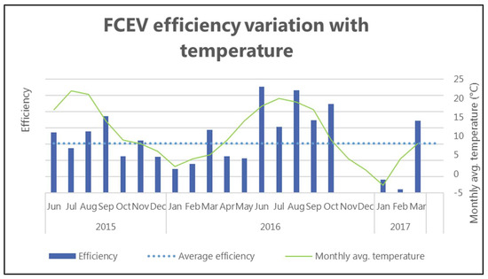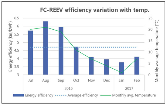 As with the FCEVs, monitoring of the FC-REEVs over time allows for study of the variation in the vehicle’s fuel efficiency (measured in terms of the number of kilometres driven per kg of hydrogen used by the vehicle) with temperature in each month over the deployment period. This is shown in Figure 9 for one of the vehicles operating in Paris. The data shows a good correlation of increasing ambient temperature with decreasing fuel usage (and thus increasing vehicle efficiency) over the period. As discussed in Section 2.3.1, this is a well-known phenomenon for conventional and alternatively-fuelled vehicles.