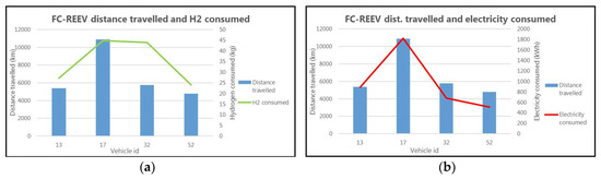 The Symbio Kangoo ZE H2 is a fuel cell range-extended electric vehicle that can refuel with electricity and hydrogen. Therefore, as shown in Figure 7, there is no simple direct correlation between distance driven and hydrogen and electricity consumption for the set of vehicles that has been monitored in detail (i.e., vehicles that drive similar distances, such as vehicles 32 and 52 in Figure 7, do not necessarily use the same amount of hydrogen, as they may fuel more with electricity than with hydrogen).