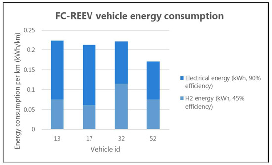 Figure 8 shows how the overall energy consumption of the vehicles varies with distance under the simplified assumptions of this model. The figure shows that, under these assumptions, the overall vehicle energy consumption (i.e., hydrogen plus electricity) per km is approximately the same for three of the vehicles, while the fourth (vehicle 52) appears to be driven more efficiently. In practice, this means that, to the driver, the vehicle drives as a normal electric vehicle irrespective of whether the fuel is hydrogen, electricity, or a combination of both.