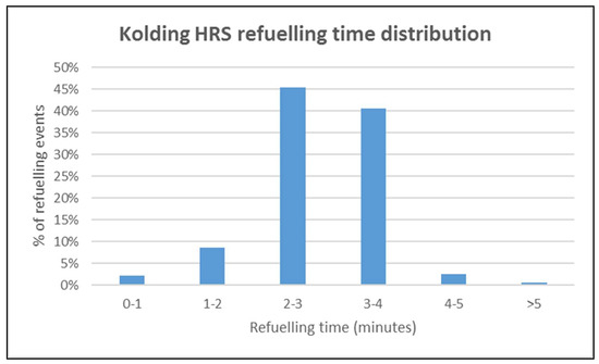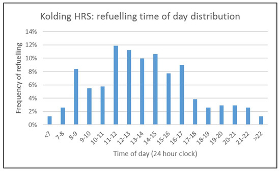 The Kolding station was opened in March 2016. The HRS is publicly-accessible, open 24/7, and serves FCEV passenger vehicles as part of the wider Danish hydrogen refuelling station network. Figure 10 shows the observed refuelling patterns of the station over a 24 h period. The figure shows evidence of a morning peak between 08:00–09:00 h, presumably as people are travelling to work, and then consistent usage between 12:00–17:00 h, until usage falls away in the evening. The HyTEC project observed similar evidence of refuelling peaks with fleet vehicles in Copenhagen, although in that case, the peak was shifted later because FCEVs tended to be fuelled after they had been collected from their overnight parking place [11]. The variation of HRS usage over the day, and user’s refuelling and station-usage preferences as the network grows, are among the main questions that H2ME is trying to answer to aid planning of future HRS networks, and will be reported in more detail over the project as further stations and vehicles are deployed.