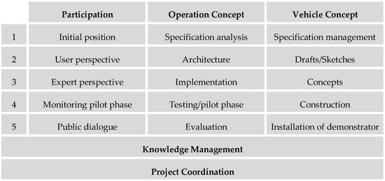 Citizen workshop results are complemented by expert interviews and analysis of existing vehicle concepts as well as legislative and normative requirements (e.g., DIN EN 13816:2002-07). Conflicts of objectives are evaluated using the “House of Quality” which is part of the quality function deployment (QFD) method [20,21,22]. Customer requirements are correlated with functional and technical options in a matrix structure that includes weighting and provides support for conceptual decisions. Relevant issues such as environmental effects, safety, comfort, availability and information provision are addressed.