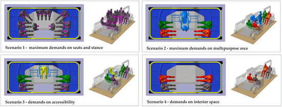 The vehicle interior is developed in a user-centered, centrifugal way, meaning that the overall vehicle length, width and height result mostly from the physical consideration of the vehicle users by applying the digital man model RAMSISTM. The model serves for the evaluation of ergonomic aspects. Based on observations of today’s usage behavior, four different usage scenarios, which result from vehicle operations at different daytimes, were derived [23] and define the vehicle interior for different types of use. For example, in the case of vehicle operation during main traffic periods, it is assumed that the bus is used by professional commuters, and the interior will be accordingly designed. Another scenario assumes that the bus is used mainly by so-called everyday users and occasional users, which requires different layout features. The four scenarios used for layout derivation are presented in Figure 5.