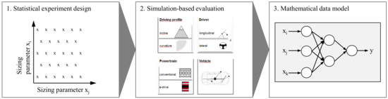 In this method, a solution space consists of a defined hybrid powertrain topology, various sizing variables and evaluations of the combinations of these two aspects in a defined investigation scenario. To generate a compensatory and computationally efficient model of such a solution space, a three-step approach in the style of [1,2,3] is applied, as shown in Figure 1.