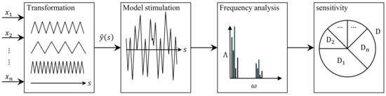 Secondly, is stimulated. This leads to an oscillation, which indicates correlations between a design variable and an evaluation criterion. In the third step, a frequency analysis is performed to quantify these correlations, which are determined by their frequency-specific amplitudes, Comparative calculations of these amplitudes reveal the specific impact of each design variable in the last step. According to Equation (3), a main impact results from the sum of frequency specific amplitudes in relation to the sum of all amplitudes .